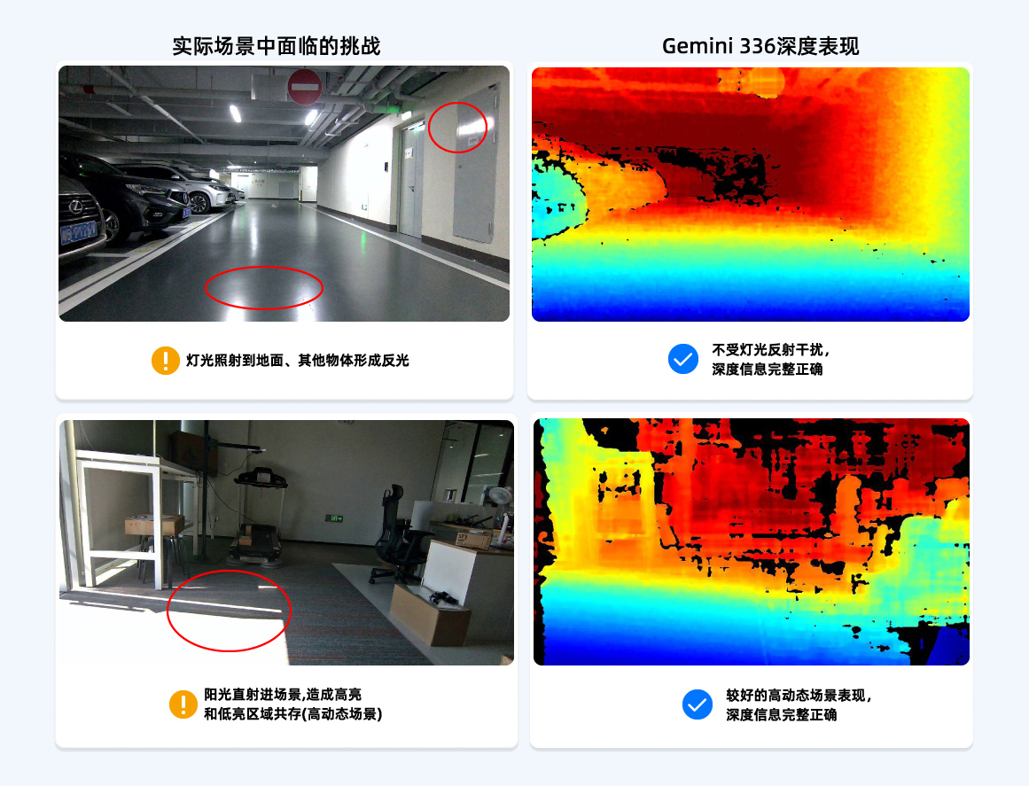 Gemini 336/336L相機(jī)解決了眩光、反光地面及高動(dòng)態(tài)場景中暗部區(qū)域的深度成像質(zhì)量問題
