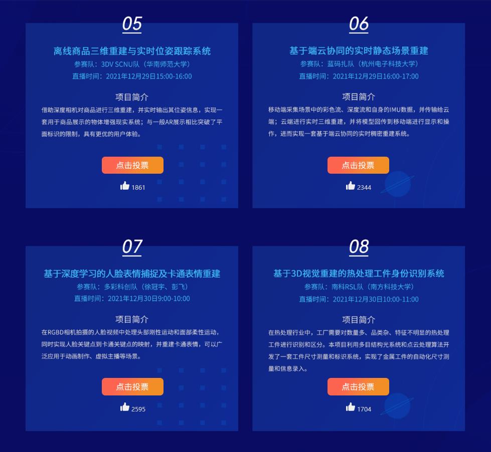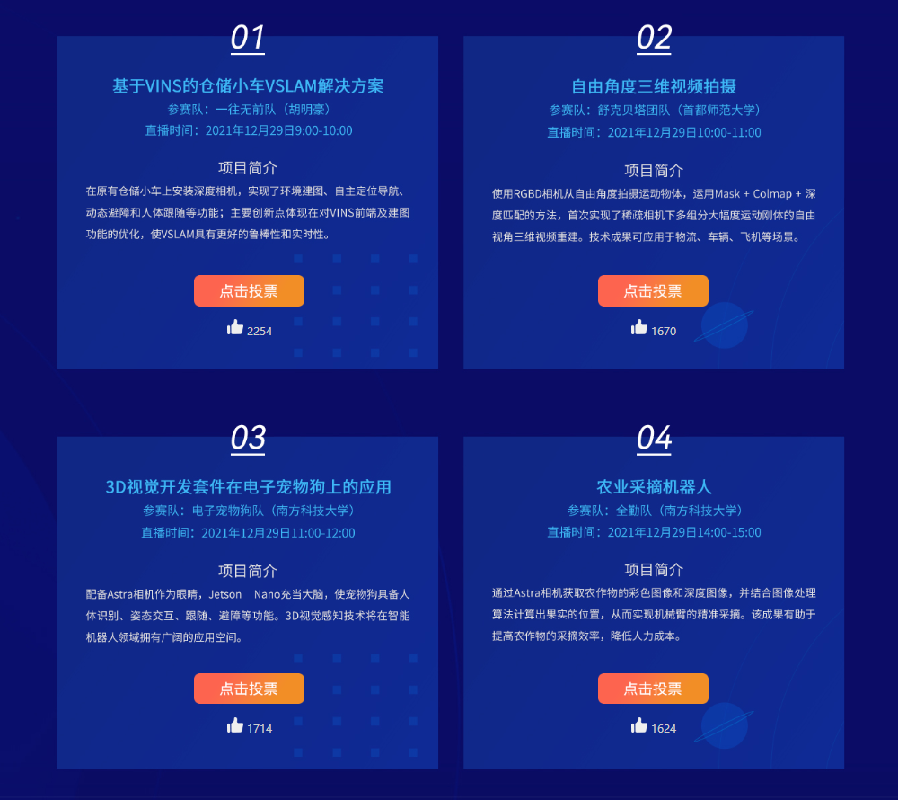 參賽項目均基于奧比中光3D相機與Jetson Nano的組合套件開發(fā),展現(xiàn)出創(chuàng)新意義與應(yīng)用價值兼具的方案。在決賽環(huán)節(jié),8支隊伍展示了基于VINS的倉儲小車VSLAM解決方案、自由角度三維視頻拍攝、3D視覺開發(fā)套件在電子寵物狗上的應(yīng)用等項目。