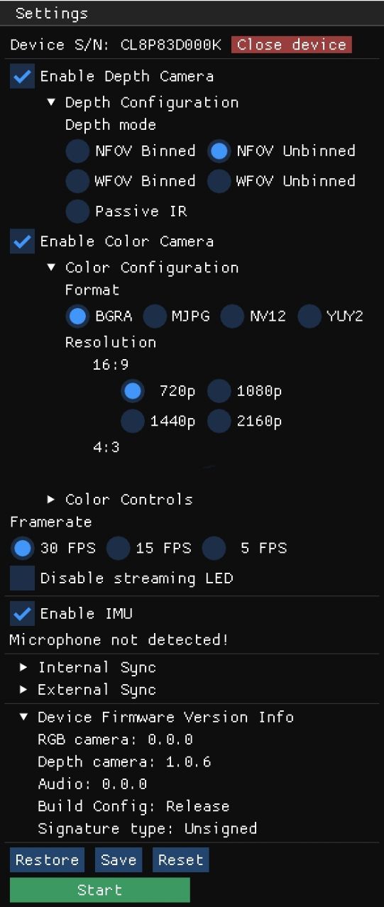 可以使用 Femto Bolt 查看器(可在工具的安裝目錄中找到,文件名為 k4aviewer.exe)將所有設備數(shù)據(jù)流可視化顯示出來。例如,查看器的路徑為 C:\Program Files\Orbbec-SDK-K4A-Wrapper-vX.Y.Z\tools\k4aviewer.exe,其中 X.Y.Z 是安裝的 SDK 版本。